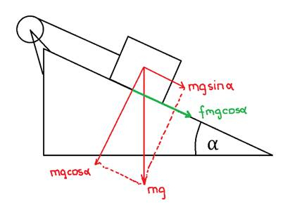 Najlepiej jest rozrysować sobie rozkład sił wynikający z siły ciężkości kontenera i tożsamości trygonometrycznych. Siła tarcia (zielony kolor na rysunku) działa w dół, ponieważ jest przeciwnie skierowana, do ruchu kontenera.