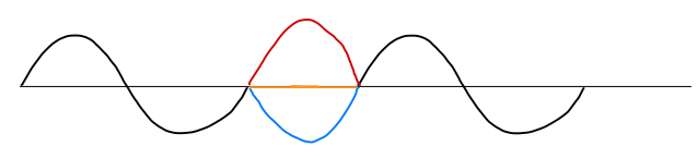 Czerwony i niebieski – przebieg fali, gdyby nie nakładały się na siebie,