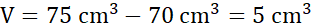 Objętość kulki wraz z wodą wynosi 75 cm3, a objętość samej wody to 70 cm3, dlatego objętość samej kulki to różnica tych wielkości.
