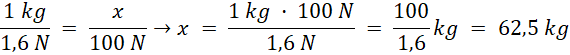 Na ciało o masie 1 kg na Księżycu działa siła ciężkości równa około 1,6 N, czyli na ciało o masie x kg będzie działała siła ciężkości równa 100 N. Możesz zapisać to jako proporcję i wyznaczyć z niej masę ciała x: