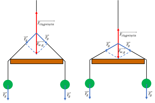 Na końce nici działają siły ciężkości ciężarków. Brzeg książki działa jak krążek prosty – powoduje przeniesienie siły z jej wartością w innym kierunku (cały czas siły działają wzdłuż nitki). W punkcie zaczepienia siły ciężkości z obu stron się sumują, aby podnieść ciężarki trzeba przezwyciężyć tę siłę wypadkową ciążenia: