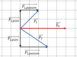 Możesz rozłożyć podane siły na składowe działające w pionie i poziomie, a następnie odpowiednio je ze sobą sumować w tych kierunkach. Jak możesz zaobserwować pionowe składowe obu działających sił są sobie równe, wobec czego siła wypadkowa działająca w pionie będzie wynosiła 0. Siły składowe poziome natomiast są skierowane w tą samą stronę i są sobie równe, wobec czego siła wypadkowa działających sił będzie ich sumą. Wektor siły wypadkowej będzie długi na 5 kratek, czyli ta siła wypadkowa ma wartość 5 N.