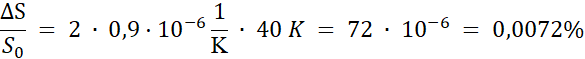 Korzystamy ze wzoru na rozszerzalność zmianę powierzchni ciała w wyniku rozszerzalności cieplnej. Względny przyrost to iloraz przyrostu i wartości początkowej. Zmiana temperatury w skali Celsjusza ma taką samą wartość w skali Kelwina.