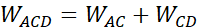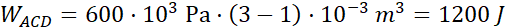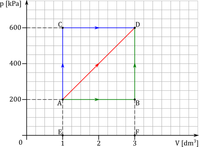 W tym zadaniu oblicz pracę wykonaną przez gaz doskonały jednoatomowy przy przejściu ze stanu A do D na drogach: ABD (zielona), ACD (niebieska) i AD (czerwona).