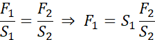Korzystamy ze wzoru na ciśnienie oraz z prawa Pascala, z równości ciśnień w zbiorniku otrzymujemy zależność sił i powierzchni.