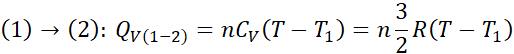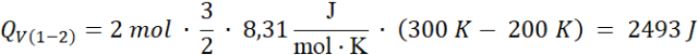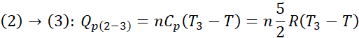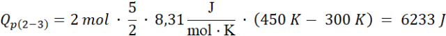 Korzystamy ze wzorów na ciepło molowe dla gazu jednoatomowego przy stałej objętości i przy stałym ciśnieniu. Ciepło pobrane jest równe sumie ciepłą pobranego w przemianach, w których rośnie temperatura.