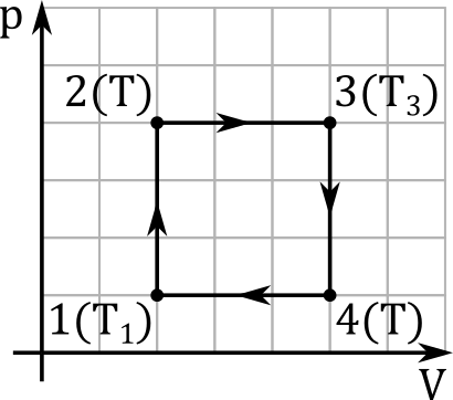 W tym zadaniu oblicz sprawność cyklu termodynamicznego, który składa się z dwóch przemian izobarycznych i dwóch izochorycznych takich, że temperatura gazu w punkcie (1) wynosiła T1 = 200 K, w punkcie (3) T3 = 450 K, a temperatury w punkcie (2) i (4) T = 300K. Liczba moli gazu doskonałego to n = 2 mole, ciepło pobrane przez gaz w ciągu jednego cyklu to 8726 J, a praca wykonana przez gaz podczas jednego cyklu wynosi 831 J. Przyjmij stałą gazową