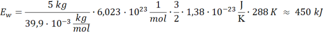 W tym zadaniu oblicz energię wewnętrzną gazu w butli wypełnionej argonem o masie m = 5 kg i temperaturze TC = 15oC, zakładając, że energia wewnętrzna gazu jest równa energii kinetycznej ruchu postępowego jego cząsteczek. Przyjmij masę molową argonu
