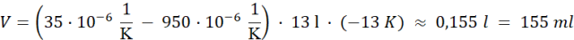 Korzystamy ze wzoru na rozszerzalność objętościową. Zmiana temperatury w skali Celsjusza ma taką samą wartość w skali Kelwina.