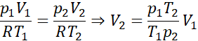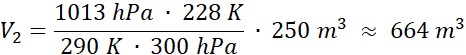 W tym zadaniu oblicz objętość wodoru w balonie na wysokości h, jeśli panuje tam ciśnienie p2 = 300 hPa i temperatura T2 = -45oC, a podczas startu balon miał objętość V1 = 250 m3 przy ciśnieniu atmosferycznym p1 = 1013 hPa i w temperaturze otoczenia T1 = 17oC.