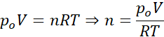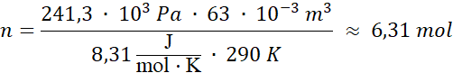 W tym zadaniu oblicz liczbę moli azotu w oponie o objętości V = 63 dm3, jeśli panuje w niej ciśnienie po = 241,3 kPa i temperatura T = 17oC. Stała gazowa