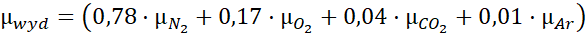 Korzystając z układu okresowego, wyznaczamy masy molowe poszczególnych składników powietrza. Masę molową powietrza wyznaczamy, sumując iloczyny masy molowej i udziału procentowego wszystkich składników powietrza.