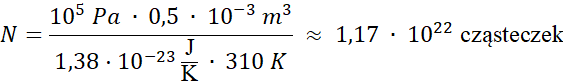 Temperatura wewnątrz płuc wynosi T = 310 K, a ciśnienie wewnątrz płuc jest takie samo jak ciśnienie atmosferyczne. Z równania Clapeyrona możemy obliczyć liczbę cząstek wdychanego powietrza: