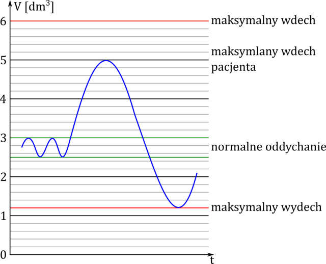Odczytana z wykresu objętość wdychanego powietrza podczas normalnego oddychania to Vwd = 0,5 dm3.
