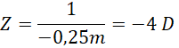 Soczewka jest soczewką wklęsłą, zatem f = -25 cm = -0,25 m