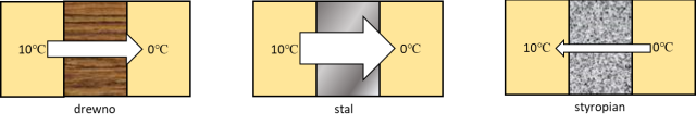 Stal jest dobrym przewodnikiem ciepła, drewno jest izolatorem, a styropian jeszcze lepszym izolatorem. Dlatego przez stal przewodzenie ciepła jest dużo szybsze niż przez drewno, a przez styropian wolniejsze niż przez drewno.