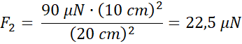 W tym zadaniu oblicz siłę oddziaływania kulek z odległości 20 cm, jeśli z odległości 10 cm odpychają się siłą 90 μN.