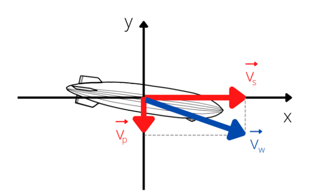 Sterowiec porusza się na wschód, więc wektor jego prędkości ma kierunek poziomy i zwrot w prawo. Wiatr wieje na południe, dlatego wektor prędkości powietrza jest skierowany pionowo w dół. Należy pamiętać o zachowaniu stosunku wektorów 3:8 z uwagi na ich wartość.