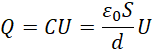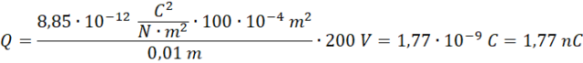 Wykorzystujemy wzór na pojemność kondensatora, który przekształcamy do postaci wzoru na ładunek zgromadzony na kondensatorze. Pojemność wyrażamy za pomocą wzoru prawdziwego dla kondensatora płaskiego.