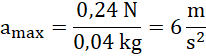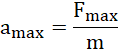 Wykorzystujemy dane z treści zadania i wykresu, a także wzór na przyspieszenie. Jest ono wprost proporcjonalne do siły, więc aby otrzymać maksymalne przyspieszenie, podstawiamy wartość maksymalnej siły.
