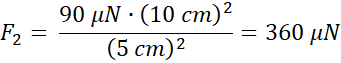 W tym zadaniu oblicz siłę oddziaływania kulek z odległości 5 cm, jeśli z odległości 10 cm odpychają się siłą 10 μN.