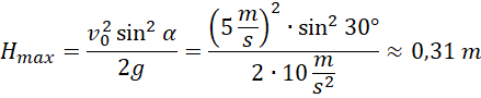 Wiedząc, że kulka była wystrzelona ukośnie pod kątem 30° do poziomu z szybkością 5 m/s oblicz maksymalną wysokość, na którą może wznieść się ta kulka.