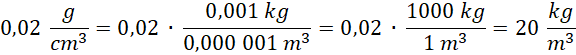 Aby zamienić gęstość substancji podaną w granach na centymetr sześcienny na kilogramy na metr sześcienny, należy tę wielkość pomnożyć przez 0,001 (ponieważ 1 g to 0,001 kg) oraz podzielić przez 0,000 001 (ponieważ 1 cm3 to 0,000 001 m3). Rodzaj substancji o tej gęstości znajdziesz w tablicach gęstości substancji.