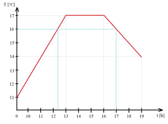Rysujemy poziomą linię od temperatury 16°C. Gdy linia ta spotka się z wykresem, rysujemy linię pionową od punktu przecięcia, wykonując rzutowanie na oś x. Z osi x odczytujemy godziny występowania danej temperatury. Pozostało jedynie obliczyć czas pomiędzy tymi godzinami, ponieważ czerwona linia wykresu jest w tych godzinach powyżej linii poziomej wyznaczającej 16°C.