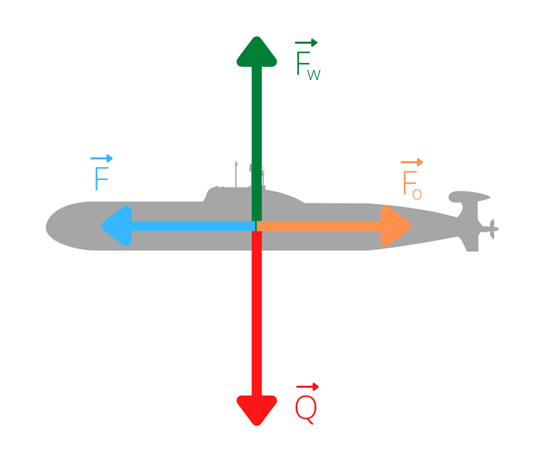 Na każde ciało umieszczone w wodzie działa siła wyporu skierowana pionowo w górę. W naszym przypadku równoważy się ona z ciężarem ciała. Na kierunku poziomym działa siła napędzająca łódź i siła oporu wody. Są one takiej samej długości, aby spełniony był warunek ruchu jednostajnego.