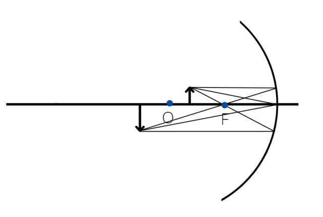 Zaznacz promień równoległy do osi optycznej, który po odbiciu przecina ognisko, promień przechodzący przez wierzchołek zwierciadła i odbijający się pod tym samym kątem oraz promień przechodzący przez ognisko i po odbiciu od zwierciadła jest równoległy do osi optycznej. W punkcie przecięcia tych promieni znajduje się grot strzałki. Obraz będzie odwrócony.