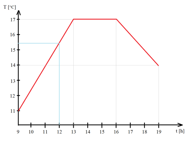 Rysujemy pionową linię od godziny 12.00. Gdy linia ta spotka się z wykresem, rysujemy linię poziomą od punktu przecięcia, wykonując rzutowanie na oś y. Z osi y odczytujemy temperaturę występującą w danej godzinie.