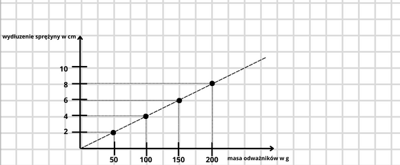 Pierwszym krokiem w narysowaniu wykresu jest wpisanie na osie odpowiednich jednostek. Podziałka sugeruje, że jednostki te powinny być takie same jak pomiary zawarte w tabeli. Następnie zaznacz punkty, prowadząc pionowe linie dla masy odważników i poziome dla wydłużenia sprężyny. Przecięcia tych linii wskażą miejsca, w których należy zaznaczyć punkty na wykresie. Poprowadzenie linii prostej przecinającej wszystkie punkty dodatkowo pokazuje, że wydłużenie sprężyny jest proporcjonalne do masy odważników.