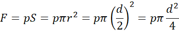 Wykorzystujemy wzór na ciśnienie, przekształcając go, otrzymując zależność na siłę. Pole powierzchni tłoka obliczamy jako pole koła.