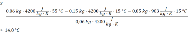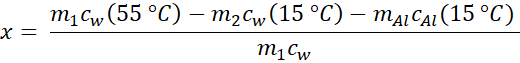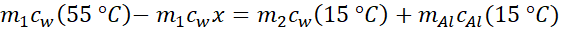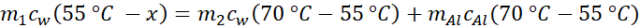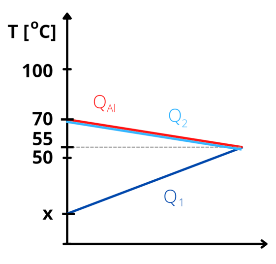 Ciepło pobierane przez zimną wodę pozyskiwane jest z oziębiającej się wody i aluminiowego kubka. Wykorzystujemy wzór na ciepło. Otrzymaną zależność przekształcamy w taki sposób, aby otrzymać wzór na temperaturę początkową zimnej wody. Potrzebne stałe odczytujemy z tabeli zamieszczonej w podręczniku.