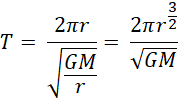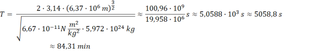 Na początku zauważamy, że prędkość satelity można wyrazić jako stosunek drogi do czasu pojedynczego obiegu. Czasem tym jest okres obiegu. Następnie zapisujemy wzór na prędkość orbitalną i podstawiamy go do wzoru na okres obiegu. Na koniec znajdujemy wartości liczbowe korzystając z tablic fizycznych i obliczamy wynik końcowy.