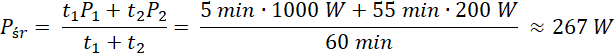 Oblicz średnią moc silnika w czasie godziny wiedząc, że przez 5 minut pracował z mocą 1000 W, a przez 55 minut z mocą 200 W.