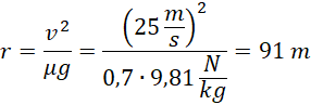 Wartość maksymalnej dopuszczalnej siły dośrodkowej jest równa maksymalnej wartości siły tarcia, porównując obie wartości i dokonując pokazanych przekształceń, możemy wyznaczyć minimalną bezpieczną wartość promienia zakrętu.