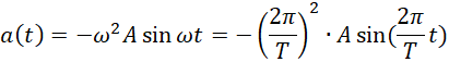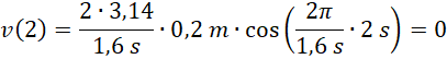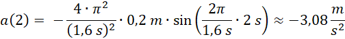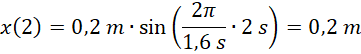 Oblicz wychylenie ciała, jego prędkość i przyspieszenie w chwili t = 2 s, jeśli wykonuje ono drgania harmoniczne o okresie T = 1,6 s i amplitudzie A = 0,2 m, a w chwili początkowej znajdowało się w położeniu równowagi.