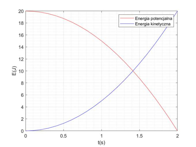 Oblicz energię całkowitą ciała, będzie ona równa maksymalnej energii potencjalnej. Następnie zapisz wzory na energię potencjalną i kinetyczną w zależności od czasu. Otrzymane zależności nanieś na wykres.