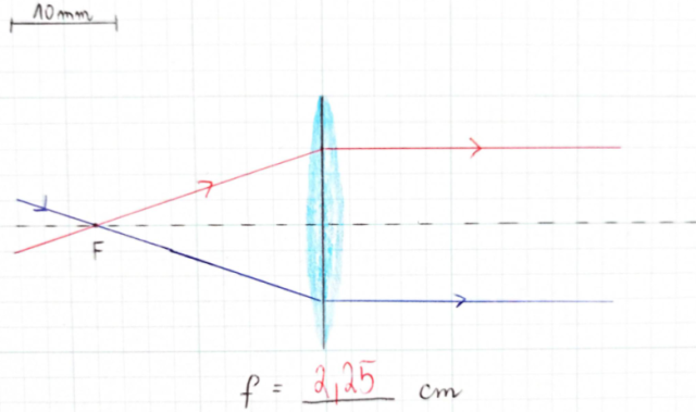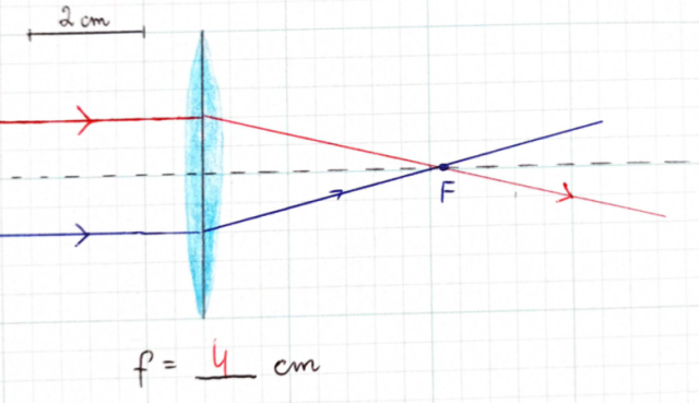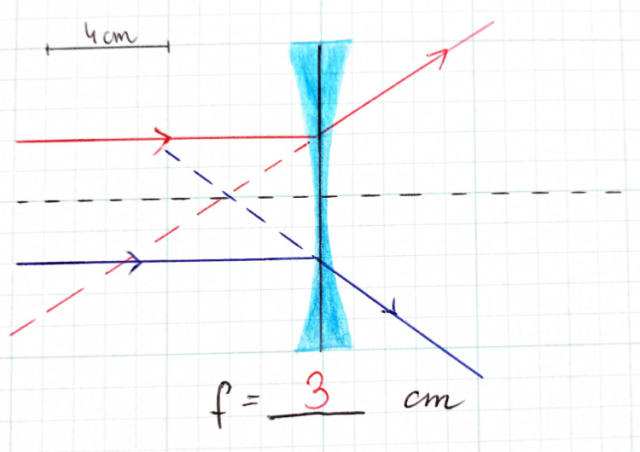 W tym zadaniu dorysuj bieg niebieskich promieni oraz wyznacz ogniskowe soczewek.