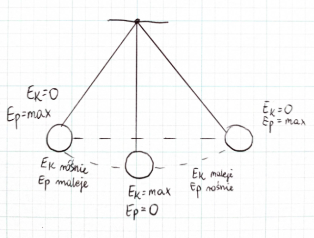 Skorzystaj z wykresu pokazującego przemiany energii w ruchu drgającym. Pamiętaj o zasadzie zachowania energii!