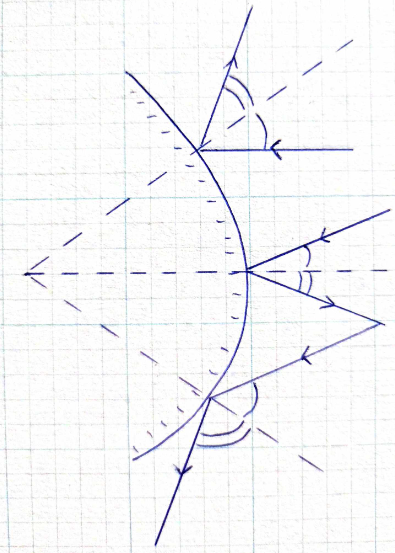 W tym zadaniu narysuj bieg niebieskich promieni po odbiciu oraz pojedynczym łukiem zaznacz kąt padania, a podwójnym łukiem – kąt odbicia.