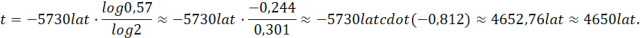 Kolejnym krokiem jest wykorzystanie wzoru opisującego rozpad połowiczy izotopu węgla-14: