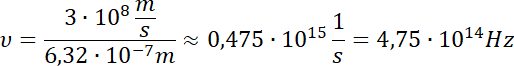 Częstotliwość fali nie zmienia się podczas przejścia między ośrodkami. Dlatego częstotliwość fali światła laserowego w powietrzu i szkle będzie taka sama. Aby obliczyć częstotliwość fali należy przekształcić wzór na prędkość światła c stanowiący iloczyn długości i częstotliwości fali w ośrodku. Aby obliczyć długość fali w szkle należy przekształcić wzór na częstotliwość fali w tym ośrodku.