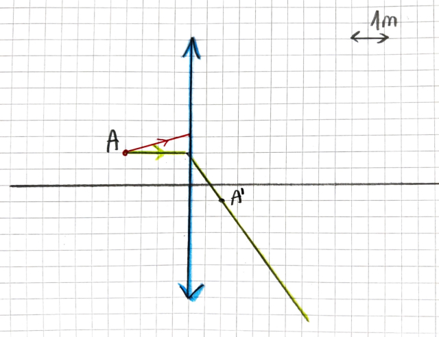 - Rysujesz linię równoległą do osi optycznej z punktu A do soczewki. Po przecięciu z soczewką, promień załamuje się tak, że jego przedłużenie przechodzi przez punkt A'.