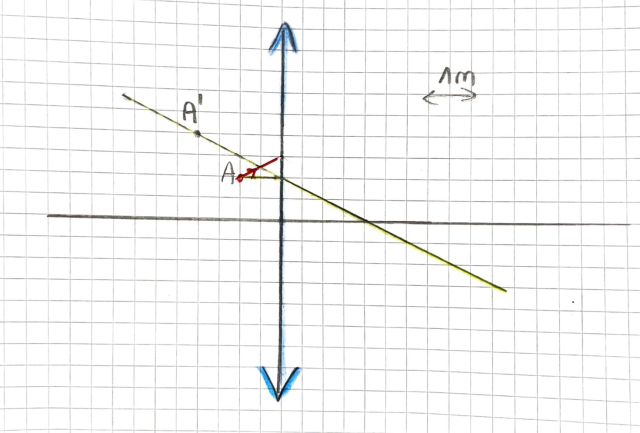 - Następnie przeprowadź linię równoległą do osi optycznej z punktu A do soczewki. Po przecięciu z soczewką, promień skieruje się ku punktowi A'.