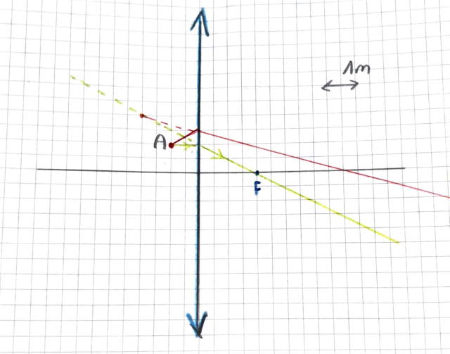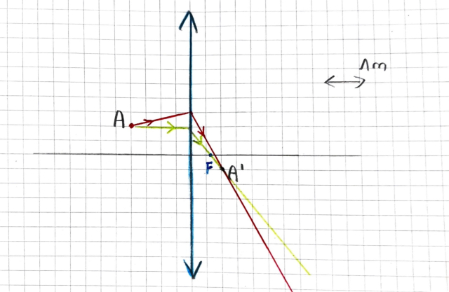 Widoczny na ilustracji promień światła, przechodząc przez soczewkę, załamuje się tak, że kontynuując jego ścieżkę dochodzisz do wirtualnego odbicia (punktu A') obiektu: