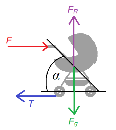Kobieta próbowała pchać wózek ze stałą prędkością, mimo że wózek miał zablokowane koła. Masa wózka z dzieckiem to 20 kg, a rączka wózka tworzy z poziomem kąt 60º, współczynnik tarcia pomiędzy kołami a podłożem to 0,2. Policz, jaka jest wartość siły tarcia, która działa na kółka wózka z przypadku w podpunkcie a).