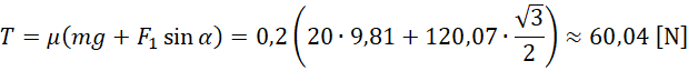 Kobieta próbowała pchać wózek ze stałą prędkością, mimo że wózek miał zablokowane koła. Masa wózka z dzieckiem to 20 kg, a rączka wózka tworzy z poziomem kąt 60º, współczynnik tarcia pomiędzy kołami a podłożem to 0,2. Policz, jaka jest wartość siły tarcia, która działa na kółka wózka z przypadku w podpunkcie b).