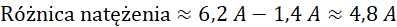 Odczytaj z wykresu ile wynosi natężenie prądu (I1) dla napięcia sterującego 5 V (U1), oraz wynosi natężenie prądu (I2) dla napięcia sterującego 7 V (U2). Zmiana natężenie to różnica I2 i I1.